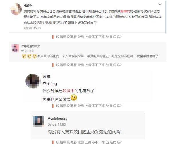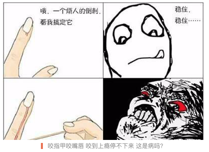 夜深人靜時(shí)悄悄到網(wǎng)上尋找同道中人,沒想到有這種癖好的筒子們還真不在少數(shù),大家紛紛表示,不只是被摳掉的倒剌、咬掉的指甲、剝離的痘印,甚至連口腔里兩頰旁邊的肉也難以幸免。