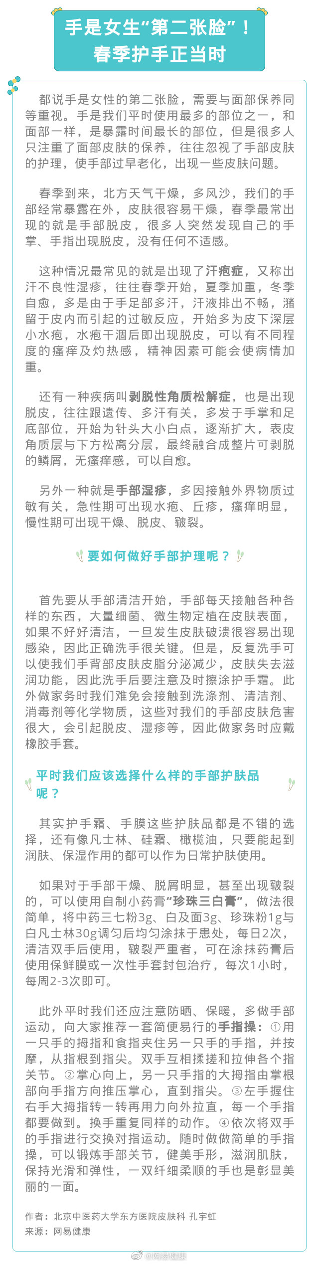 手是女性的第二張臉,需要與面部保養(yǎng)同等重視。疫情期間,難免需要經(jīng)常洗手,但反復(fù)洗手會(huì)使我們手背部皮膚皮脂分泌減少,皮膚失去滋潤(rùn)功能。那么我們?cè)撊绾巫龊檬植孔o(hù)理呢?平時(shí)應(yīng)選擇什么樣的手部護(hù)膚品呢?皮膚科醫(yī)生為您支招!