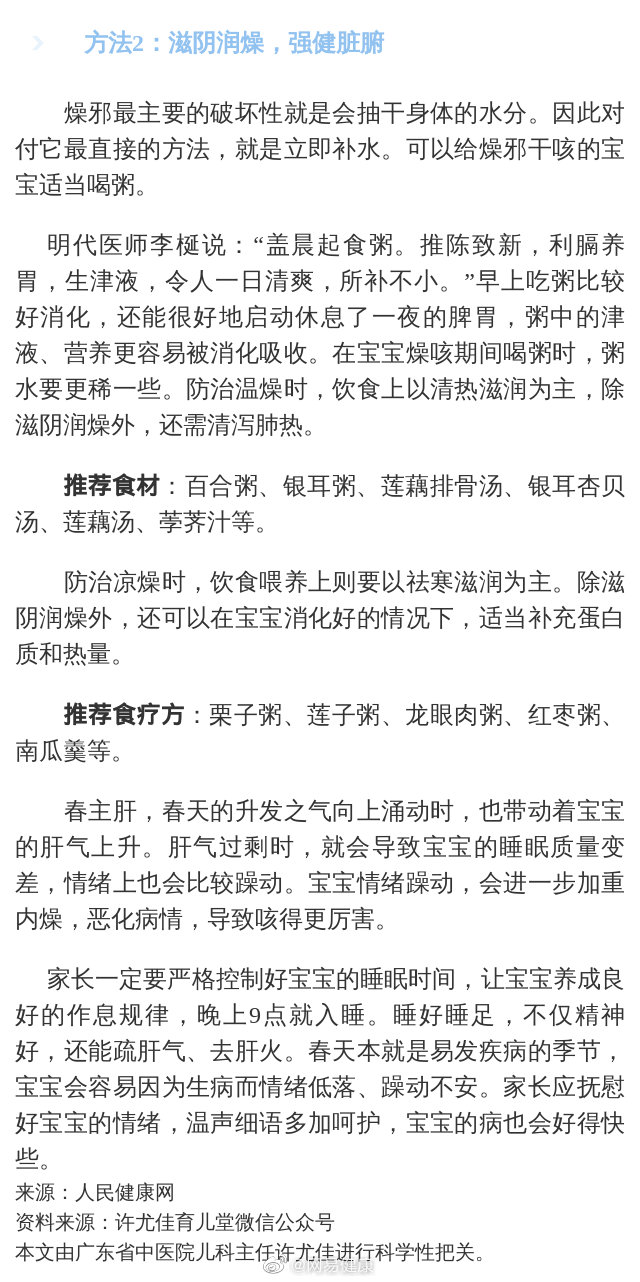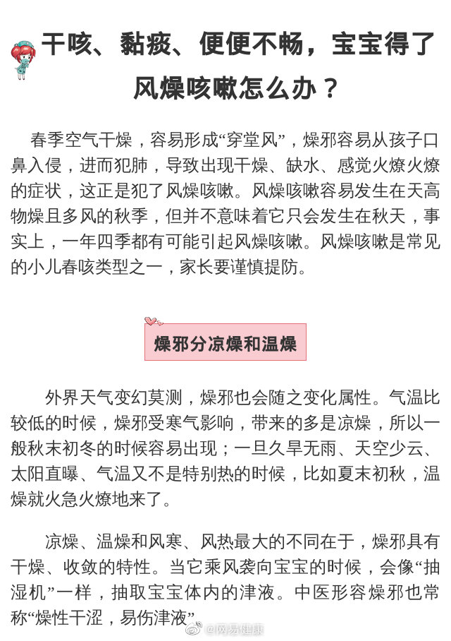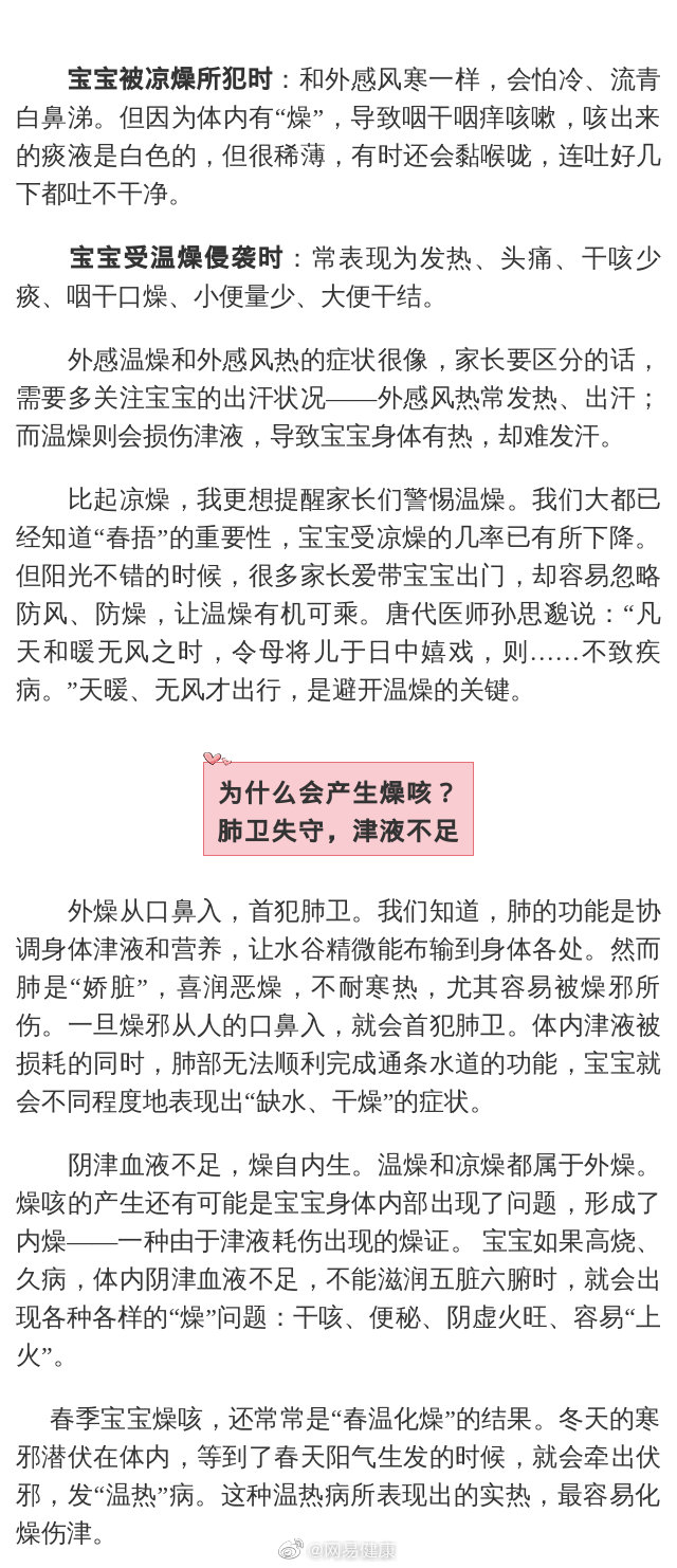 春季空氣干燥,容易形成“穿堂風(fēng)”,燥邪容易從孩子口鼻入侵,進(jìn)而犯肺,導(dǎo)致出現(xiàn)干燥、缺水、感覺火燎火燎的癥狀,這正是犯了風(fēng)燥咳嗽。風(fēng)燥咳嗽是常見的小兒春咳類型之一,家長要謹(jǐn)慎提防。為什么會(huì)產(chǎn)生燥咳?該如何護(hù)理呢?