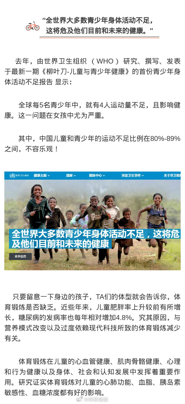 全球每5名青少年中,就有4人運動量不足,且影響健康,這一問題在女孩中尤為嚴重。其中,中國兒童和青少年的運動不足比例在80%-89%之間,不容樂觀!想帶孩子鍛煉,又怕TA在運動過程中受傷?快來看看美國兒科學會提出的兒童全年齡段運動建議吧!