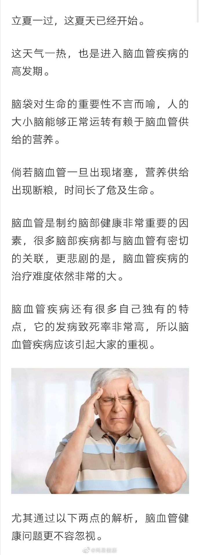 立夏一過,這夏天已經(jīng)開始。這天氣一熱,也是進(jìn)入腦血管疾病的高發(fā)期。腦血管是制約腦部健康非常重要的因素,很多腦部疾病都與腦血管有密切的關(guān)聯(lián),更悲劇的是,腦血管疾病的治療難度依然非常的大。那么如何預(yù)防腦血管疾???在生活中,怎么做才能盡可能的避免發(fā)病呢?(來源:漫說健康)