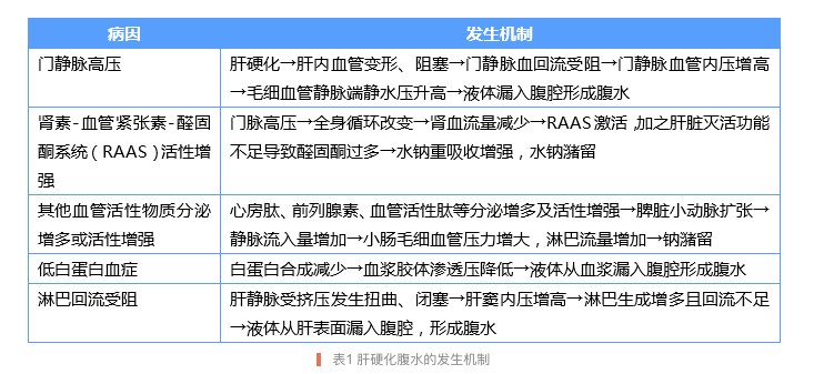 目前認(rèn)為,肝硬化腹水形成的原因有:門靜脈高壓、腎素-血管緊張素-醛固酮系統(tǒng)(RAAS)活性增強(qiáng)、其他血管活性物質(zhì)分泌增多或活性增強(qiáng)、低白蛋白血癥、淋巴回流受阻(表1)。
