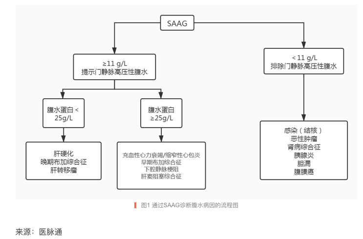 檢測血清-腹水白蛋白梯度(serum-ascites albumin gradient, SAAG)有助于判斷腹水的病因,對于既往無肝病史,初次就診的腹水患者的病因診斷有所幫助。SAAG即血清白蛋白與同日內(nèi)測得的腹水白蛋白間的差值[SAAG = 血清白蛋白(g/L)﹣腹水白蛋白(g/L)](“同日檢測”是關(guān)鍵!)。SAAG≥11 g/L有97%的概率為門靜脈高壓性腹水。SAAG<11 g/L的腹水多為非門靜脈高壓性。
